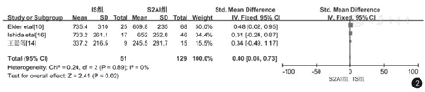 3篇研究[10,12,14]报道了手术时间比较。结果显示无统计学异质性(P=0.89,I2=0%),采用固定效应模型分析。Meta分析结果显示,S2AI组手术时间少于IS组,差异有统计学意义(SMD=0.40,95%CI 0.08~0.73,P=0.02)。见图2。