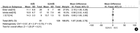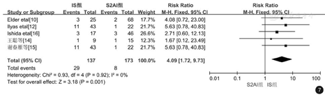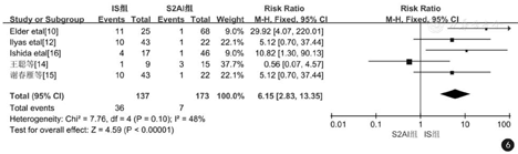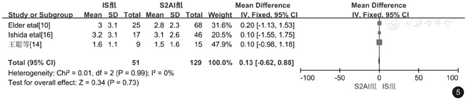 纳入5项研究310例患者,其中高质量文献3篇,中等质量文献2篇。Meta分析显示:对于成人脊柱骨盆固定,S2AI固定技术手术时间(SMD=0.40, 95%CI 0.08~0.73, P=0.02)、术后感染率(RR=6.15, 95%CI 2.83~13.35,P<0.01)及内固定失败率(RR=4.09, 95%CI 1.72~9.73, P=0.001)均低于IS固定技术,差异均有统计学意义,而住院时间(WMD=1.07, 95%CI -0.60~2.75, P=0.21)、术中出血量(SMD=0.29, 95%CI -0.03~0.62, P=0.08)及术后VAS(WMD=0.13, 95%CI, -0.62~0.88; P=0.73)两种固定技术差异均无统计学意义。