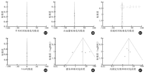 本研究对纳入5篇文献进行了严格的质量评价,漏斗图定性分析显示,平均手术时间、平均术中出血量、平均住院时间、VAS、内固定失败率均无明显偏倚,术后感染率存在小的偏倚。见图8。
