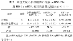 两组大鼠心肌细胞凋亡指数、miRNA–214及HIF–1α mRNA相对表达量比较(