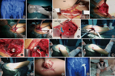 气管内全身麻醉,健侧卧位并维持骨盆横轴垂直于手术台。从髂前上棘向下向外2 cm,指向腓骨小头做一约8 cm切口,逐层切开皮肤、皮下组织及半透明膜,略偏外显露进入阔筋膜张肌和缝匠肌的间隙,外侧放置两把Hohmann拉钩牵开阔筋膜张肌及臀中肌,内侧放置一把"S"拉钩牵开缝匠肌与股直肌,充分显露Hueter间隙(缝匠肌/股直肌-阔筋膜张肌)。电凝止血旋股外侧动脉升支,一把宽Hohmann拉钩替换"S"拉钩将髋臼上缘分离的股直肌反折头向内侧牵开,充分暴露前方关节囊。切除前关节囊,按术前模板测量选择合适型号的假体并确定截骨位置,股骨小转子上方约1.5 cm与股骨颈垂直方向截断股骨颈,若关节僵硬骨赘多可选择两次截骨取出股骨头。髋臼4点和7点位置两把Hohmann拉钩满意显露髋臼,切除盂唇、关节囊及臼缘增生骨赘,髋臼锉磨满意后压配置入臼杯及内衬。切除股骨侧后外上方关节囊,在大转子后侧、外侧及小转子近股骨距位置分别置入3把Hohmann拉钩牵开内侧及外侧肌群,极度内收、后伸、外旋患肢,逐步松解外旋肌群直至显露并抬起股骨近端,股骨近端开口后髓腔锉扩髓,选择合适型号假体柄压配固定,安装股骨头试模复位髋关节。如果复位困难,常预示肢体延长。检查各方向稳定性良好无脱位倾向及双下肢肢体是否等长。置入股骨头假体,关节腔灌注1.0 g氨甲环酸,罗哌卡因肌肉切口局封,逐层关闭切口[8](图1)。