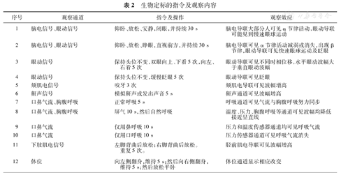 3.生物定标:规范专业的生物定标是每次进行睡眠监测的必要部分。通过观察被监测者按照指令做出相应动作而采集的信号,可以记录患者生理指标的基础参数,如脑电记录中的α节律、胫前肌肌电活动幅度等,并确定电极安放位置是否准确,监测设备、传感器及电极是否处于正常工作状态。这些指令动作包括闭眼、睁眼、眼球向上下左右方向活动、吸气、呼气、屏气、活动足趾等(表2)。监测前及监测后均应进行生物定标。