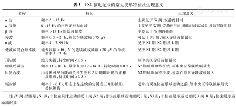 识别脑电记录波形是睡眠分期的重要基础。除了在常规脑电图监测中常见的α波、β波、δ波等波形外,还有一些特有的脑电波形,是判读相应睡眠期的主要依据或参考,包括α节律、低波幅混合频率波、顶尖波、睡眠纺锤波、K复合波、慢波、锯齿波等(表3)。