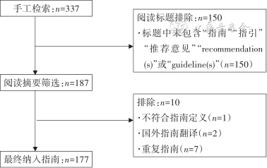 1. 检索结果:手工检索337条指南记录,根据纳入标准最终纳入177部指南,筛选流程见图1。