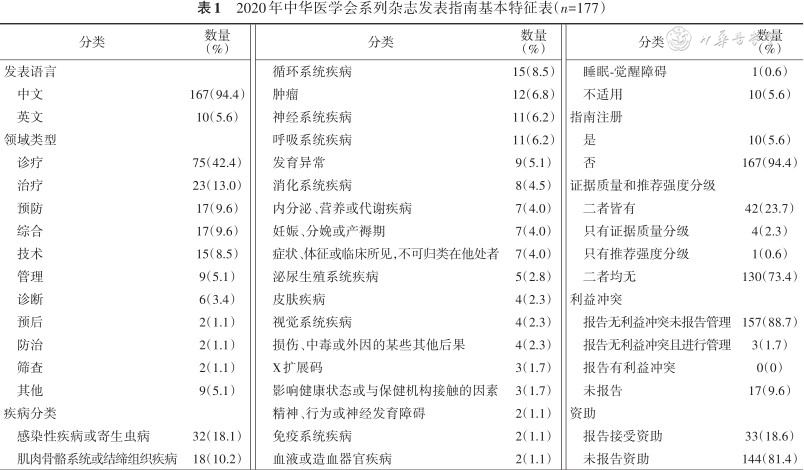 2020年中华医学会系列杂志发表指南基本特征表(n=177)