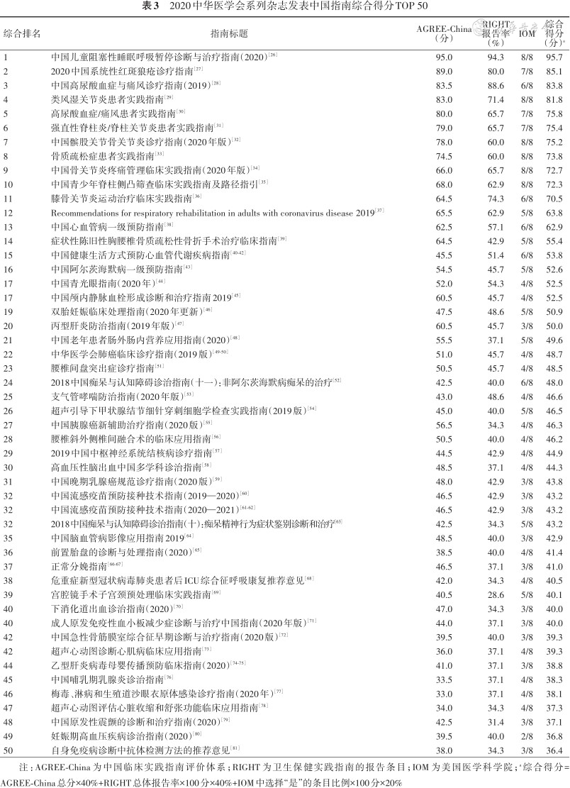 2020中华医学会系列杂志发表中国指南综合得分TOP 50