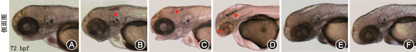 麻醉剂Tricaine(货号:E10521)和丙基硫氧嘧啶(propylthiouracil,PTU)(货号:P0643)均购自美国MERCK公司;Dextran-Rhodamine-10 kD(货号:D1816)和4′,6二脒基-2-苯吲哚(4′,6-diamidino-2-phenylindole,DAPI)(货号:62248)均购自美国Invitrogen公司,吗啉代寡核苷酸(morpholino oligonucleotides,MO)由GeneTools公司设计提供;纯水净化系统(美国Millipore公司);体式荧光显微镜(日本Olympus公司);激光共聚焦显微镜(德国Leica公司)。