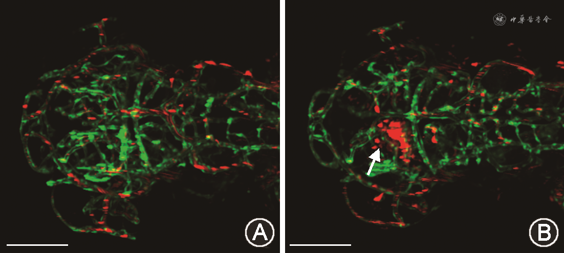 荧光视野下观察到,注射了Control MO的Tg(flk1:GFP;gata1:dsRed)双转基因斑马鱼胚胎中红细胞分布在血管以内,荧光视野下观察到的红细胞渗漏现象发生率为0.37%(1/273);而注射col8a1 MO的Tg(flk1:GFP;gata1:dsRed)双转基因斑马鱼胚胎中红细胞溢出血管,在脑实质中堆积(图2),荧光视野下观察到的红细胞渗漏现象发生率为18.18%(52/286)(χ2=51.65,P<0.001)。