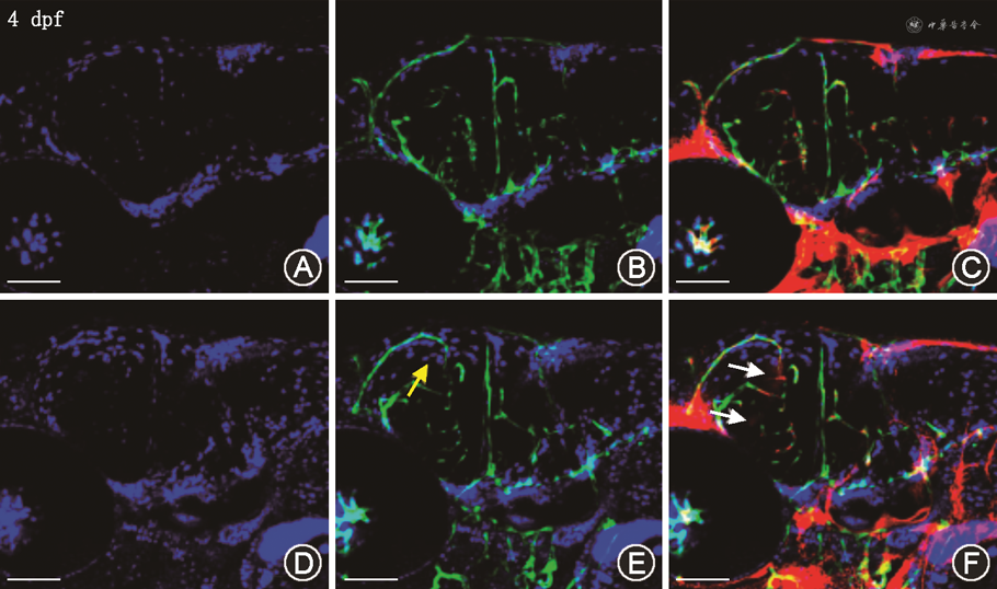 为观察BBB渗漏情况,并对渗漏情况进行统计,本研究用Dextran-Rhodamin和DAPI染料来构建斑马鱼脑出血的BBB模型。收集单细胞时期Tg(flk1:GFP)转基因斑马鱼胚胎,对照组依然予以注射Control MO,实验组注射col8a1 MO。正常培养至受精后2 d挑选脑出血的胚胎进行培养,在受精后3 d用100 mg/ml的tricaine麻醉幼鱼,经基底静脉注射Dextran-Rhodamin和DAPI混合液,1 h后用共聚焦显微镜拍照观察幼鱼脑血管渗漏情况。由于斑马鱼脑血管生长开始于受精后24 h左右,至受精后48~72 h新生血管较易出血,因此本研究在受精后48~72 h观察斑马鱼脑出血情况。