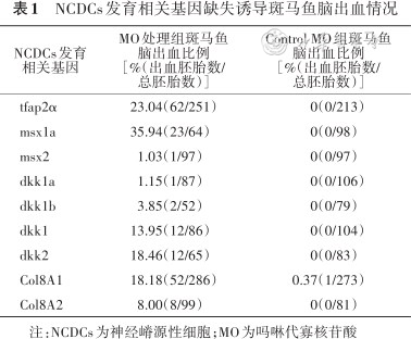 | NCDCs发育相关基因 | MO处理组斑马鱼脑出血比例[%(出血胚胎数/总胚胎数)] | Control MO组斑马鱼脑出血比例[%(出血胚胎数/总胚胎数)] |