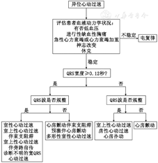 心律失常的发生和发展受许多因素影响。恶性心律失常可能在短时间内危及患者生命,心律失常急性期首先应根据血液动力学状态决定处理原则。血液动力学状态不稳定包括进行性低血压、休克、急性心力衰竭、进行性缺血性胸痛、晕厥、意识障碍等。有这些情况时,无论哪种心律失常,都界定为血液动力学不稳定的心律失常。确定血液动力学状态后,按照下列流程实行诊治(图1)。