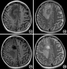 入院后于2012年9月13日全麻下行颅内占位探查活检术,术中可见灰白色脓性物质,内含大量黄色脓液,术中冰冻及术后病理提示颅内变性、坏死物及脓细胞,符合脑脓肿。术后给予静脉使用万古霉素、美罗培南及口服复方新诺明治疗,体温可降至正常,肌力无好转。7 d后脓肿脓液培养回报为单核细胞增生李斯特菌,药敏显示对青霉素G、复方新诺明及氨苄西林均敏感,故将万古霉素调整为静脉青霉素4 MU,每4小时1次,余治疗同前。患者左侧肌力逐渐恢复至3级,复查头颅MRI显示病灶缩小,周围水肿消退(图2)。但患者高热不退,腰穿脑脊液压力、常规及生化均正常,血培养阴性。2周后因肺部感染及反复菌血症,出现感染性休克、导管相关性血流感染,血培养示铜绿假单胞菌及热带念珠菌感染,于2012年11月11日病情加重,抢救无效死亡。