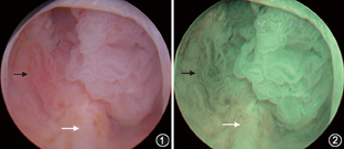 拍摄原理和技巧:采用OLYMPUS公司22 F膀胱尿道镜及高清摄像头,生理盐水作灌洗介质,配合OLYMPUS公司CV-190型号主机及内镜窄带成像系统进行拍摄。