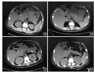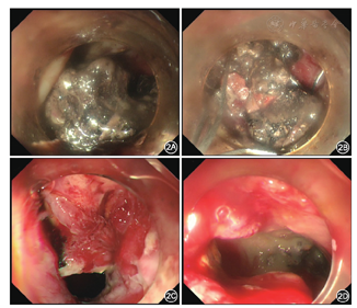 2016年1月15日在CT引导下行胰周脓肿经皮穿刺引流术,置入长25 cm、直径16 F单猪尾引流管2根,穿刺液培养为铜绿假单胞菌。此后患者体温稍下降,1个月后患者再次出现高热,伴有血压下降,联合使用去甲肾上腺素、多巴胺等血管活性药物维持血压。复查血常规示白细胞计数19.7×109/L、中性粒细胞百分比89.8%,血清降钙素原20.94 μg/L;腹部CT检查提示胰周仍有大范围脓肿(图1)。经胰腺外科等多学科会诊认为患者目前肾功能衰竭尚未恢复,且伴有感染性休克,手术风险高,建议行内镜下治疗。遂于2016年2月25日在内镜引导下行经皮内镜胰周脓肿清除术。气管插管麻醉成功后,患者仰卧位,取原腹部左侧引流管窦道,使用经皮肾镜皮肤扩张器将窦道口扩至1 cm,置入直径12 mm Trocar,置入电子胃镜,可见腹膜后大量坏死组织及脓液(图2),用网篮及三爪钳清除坏死组织,术毕置入双套管引流。此后患者体温仍有波动,于2016年3月8日及17日再次行经皮内镜胰周脓肿清除术,经治疗后患者体温恢复正常,复查降钙素原为0.747 μg/L,CT检查提示胰周脓腔基本消失。此后患者尿量逐渐增加,至2周后尿量>2 000 ml/d,先后拔除腹腔引流管、血液滤过置管和空肠营养管,于2016年5月12日痊愈出院。