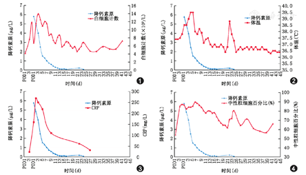 二次手术后第1天,患者发热至38.5 ℃。应用瑞士罗氏公司ELECSYS B.R.A.H.M.S降钙素原(procalcitonin,PCT)抗体试剂盒检测血清PCT为5.81 μg/L,抗菌药物升级至美罗培南;二次手术后第3天,发热至39.0 ℃,白细胞计数升至14.0×109/L,PCT 4.01 μg/L,引流液呈浑浊黄色液体,淀粉酶>3 000 U/L,留引流液培养,加用替考拉宁;二次手术后第5天,体温升至39.5 ℃,将替考拉宁换为利奈唑胺,此后体温逐渐下降,PCT在二次手术后第7日降至1.02 μg/L,较峰值下降约80%;二次手术后第10天,体温恢复正常,此时引流液培养结果回报为屎肠球菌;二次手术后第16天患者恢复饮水,PCT降至0.1 μg/L;二次手术后第18天停用抗菌药物;第22天患者再次出现发热,最高38.8 ℃,白细胞计数5.3×109/L,PCT仅上升至0.22 μg/L,未超过0.5 μg/L,考虑引流管不通畅,未使用抗菌药物,间断予以冲洗,体温在发热2 d后恢复正常;二次术后第45天,拔除引流管,康复出院。患者二次术后PCT、体温、白细胞计数和C反应蛋白的变化见图1,图2,图3,图4。患者的术后病理学诊断为十二指肠中分化腺癌。