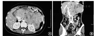 考虑肿瘤巨大(图1),且具有内分泌功能,为缓解神经系统症状及解除肿瘤占位压迫症状,于2016年4月11日行手术治疗。术中见肿物位于小网膜囊内,与胃后壁粘连致密,左侧与胰腺体尾部关系密切并侵犯脾血管,右侧累及肝十二指肠韧带,上达膈下,下方挤压左肾脏并侵犯左侧肾上腺。术中遵循"整块原则"、"无瘤原则",将肿物连同周围的胰腺体尾部、脾脏、左侧肾上腺、部位胃一并切除。术后病理回报:胰腺混合性腺泡-神经内分泌癌(mixed acinar-neuroendocrine carcinoma,MANEC),侵及胰周脂肪组织,侵及胃壁全层,紧邻脾脏及肾上腺被膜,体积16 cm×13 cm×10 cm,AACT(+),α-抗胰蛋白酶(+),AE1/AE3(+),CD56(部分+),CgA(部分+),Syn(+),ACTH(-),促肾上腺皮质激素释放激素(corticotropin releasing hormone,CRH)(+),Ki-67(index 80%)。患者术后出现胃排空延迟,予以胃管引流和肠外营养支持后好转,Clavien-Dindo分级Ⅱ级。余情况均恢复顺利,配合激素序贯减量治疗后,神经系统症状消失,ACTH和皮质醇分别降至10.2 ng/L和14.8 μg/L,甲胎蛋白、CA125、胃泌素均恢复正常,于2016年5月25日出院。患者及家属拒绝术后辅助化疗,于门诊每3个月复查影像学检查,至2018年8月发现左肾门转移病灶,并经穿刺活检证实,目前仍带瘤生存。