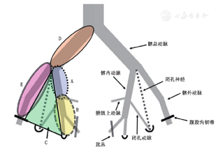 A示髂内近端血管区,B示髂内远端血管区,C示闭孔区,D示髂总血管区,E示髂外血管区