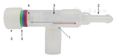 注:红箭头为吸气方向;蓝箭头为呼气方向;1:单向活瓣;2:口含嘴;3:补偿侧孔;4:弹簧装置;5:末端旋钮;6:呼气单向阀
