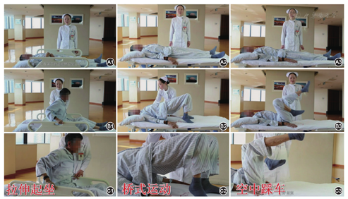 在床上做包括空中踩车、拱桥和拉伸起坐的郑氏卧位康复操(图2)。拉伸起坐的动作要领:患者双手拉住床边,利用上肢力量将上半身拉起至坐直,然后维持5 s,然后再次躺平,再次重复;桥式运动的动作要领:患者取仰卧位,膝关节屈曲,双足底平踏在床面上,用力使臀部始离床面约10~15 cm,再次重复;空中踩车的动作要领:患者取平卧位,屈膝抬高下肢,上半身保持不动,两小腿在空中交替做空踩自行车的动作,直至脚踩不动为止。根据患者的危重程度,可以在呼吸空气、氧气、无创通气或气管插管机械通气下进行。