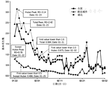 湖北省R0峰值发生在1月23日,随后迅速下降。湖北省的主要疫区是武汉市,严格的隔离措施从1月23日开始实施,不难看出,随着隔离措施的实施,传播率出现了显著的降低(图2)。从确诊病例的峰值看,湖北省的峰值时间是2月19日,可以认为这是在全国各地医护支援4万人以后获得的效果。因此,对于COVID-19这类具有较高传播效率的疾病,控制的更早介入,将累计入院患者数量控制在疫区床位总量以内,可以有效控制疫情。这就可以解释湖北域外地区疫情控制局面较好的原因。