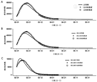 在数据方面,本研究对2月12日湖北省新增确诊病例数进行了平滑化处理。2月12日,国家卫健委发布新版指南对湖北省以及湖北省以外其他省份的病例诊断标准进行了区分,湖北省增加了"临床诊断病例"分类,对疑似病例具有肺炎影像学特征者,确定为临床诊断病例,以便患者能及早按照确诊病例相关要求接受规范治疗,进一步提高救治成功率。国家卫健委这一举措非常必要和及时,但对当日湖北省上报确诊病例数造成了巨大波动,除按照前一版指南(以荧光PCR作为最终诊断标准)上报的1 404例当日新增确诊病例外,又一次性上报了13 332例临床诊断病例[5]。考虑到此13 332例临床诊断病例并非均为当日产生,为使模型拟合更加准确,根据COVID-19治疗时间中位数12 d[6]的研究结论,将这批确诊病例按照过去12 d上报新增病例数的比例分配到2月1日至12日当日新增确诊病例中。以上的数据处理,可以形成贴近实际的数据集。