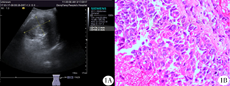 1A:彩超示脾脏内可见一低回声团块,界清,内回声不均;1B:显微镜下肿瘤细胞排列呈实性、乳头状,细胞异型明显,可见大量红细胞(HE ×400)