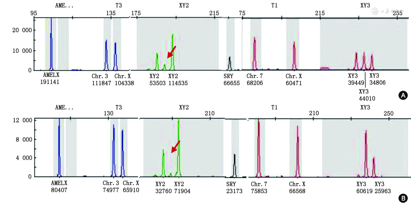 取得孕妇知情同意后,于孕22周行羊膜腔穿刺产前诊断。经染色体核型分析,胎儿的染色体核型为46,XX,Y染色体性别决定基因(sex-determining region on the Y chromosome, SRY)基因阳性。取得孕妇及家属知情同意后,又分别抽取孕妇、配偶及其子静脉血3 ml提取DNA,以及肝素抗凝血5 ml送本院检验科(医学遗传研究所)行染色体核型分析。经检测,孕妇和胎儿的核型一致,均为46,XX,SRY基因阳性。其子和配偶核型为46,XY,与社会性别一致,未见异常。而非整倍体快速检测的荧光定量聚合酶链反应(quantitative fluorescent-polymerase chain reaction, QF-PCR)检测结果显示胎儿与孕妇一致。见图1。
