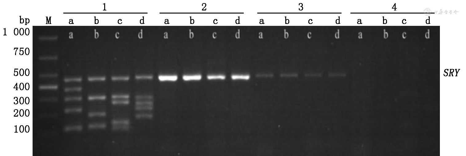 注:M:参照标准;1:正常男性对照;2:本例孕妇;3:本例胎儿;4.正常女性对照;SRY:Y染色体性别决定基因(sex-determining region on the Y chromosome);a、b、c、d分别代表AZFa、AZFb、AZFc和AZFd区