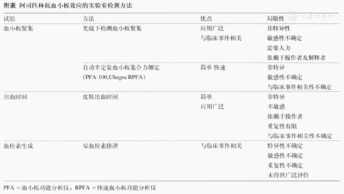 什么是阿司匹林耐药呢?阿司匹林耐药被用来描述几种不同的现象。一种是阿司匹林不能预防患者缺血性血管事件的发生,被称作阿司匹林临床耐药4。但这个定义是非特异性的,并且可以适用于框图中所列的任何一种情况。此外,指望任何单一的预防策略来阻止所有血管并发症的发生是不现实的5。阿司匹林耐药还被用来描述一种现象——针对一种或多种血小板功能试验,阿司匹林无法产生预期效应,例如抑制血栓素的生物合成6、抑制血小板聚集7、使出血时间延长5,8。这被称作阿司匹林生化耐药4。但是,目前尚未建立用来确定阿司匹林生化耐药的精确定性与定量血小板功能异常的方法,更谈不上它们与临床的相关性了。如附表所示,多种不同的实验室血小板功能测定可用以诊断阿司匹林"生化"耐药,但各有其局限性。