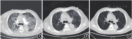 入院体检:体温38.6 ℃,心率70次/min,呼吸20次/min,血压132/78 mmHg(1 mmHg=0.133 kPa)。胸背部皮肤可见多处散在色素沉着,无皮疹及脱屑;口唇无紫绀,呼吸节律正常,双肺呼吸音粗,可闻及散在湿性啰音;心律齐,各瓣膜听诊区未闻及病理性杂音;腹部平坦,脐上可见长约8 cm纵行手术瘢痕,左上腹可见空肠造瘘管,腹部柔软无压痛,肝脾肋下未触及,余未见异常。实验室检查:白细胞计数(white blood cell,WBC)5.6×109/L,中性粒细胞0.89,嗜酸粒细胞0.005;C反应蛋白(C-reactive protein,CRP)110.4 mg/L,降钙素原(procalcitonin,PCT)4.91 μg/L;丙氨酸转氨酶(alanine aminotransferase,ALT)25 U/L,天冬氨酸转氨酶(aspartate aminotransferase,AST)39 U/L,总胆红素(total bilirubin,TBil)19.7 μmol/L,γ-谷氨酰转肽酶(γ-glutamyl transpeptidase,γ-GT)107 U/L,白蛋白25.5 g/L。胸腹部CT示双肺多发斑片影,胆囊炎。入院诊断:(1)胃腺癌(腹腔淋巴结转移、锁骨上淋巴结转移、侵犯胰腺及肝脏,T4N3M1 Ⅳ期);(2)肺部感染;(3)胆囊炎;(4)冠状动脉粥样硬化性心脏病。入院当日予哌拉西林钠他唑巴坦钠4.5 g静脉滴注、1次/8 h。入院第2天,患者出现明显胸闷、憋气,频繁咳嗽,咳出少量暗红色血性痰,体温正常。面罩吸氧(10 L/min)时脉搏血氧饱和度0.93,血气分析示pH 7.4,动脉血氧分压60 mmHg,动脉血二氧化碳分压32 mmHg,氧合指数(动脉血氧分压/吸入氧浓度)100 mmHg(参考值:400~500 mmHg);WBC 6.1×109/L,中性粒细胞0.91,嗜酸粒细胞0.003;CRP 162.4 mg/L,PCT 4.11 μg/L;B型钠尿肽168.5 ng/L,肌钙蛋白I 0.03 μg/L,D-二聚体2.88 mg/L。CT肺血管造影示双肺广泛磨玻璃样渗出,双侧胸腔积液(图1 A)。立即给予无创呼吸机辅助呼吸,转入重症医学科。转科后给予经鼻高流量氧疗(氧浓度55%,流量40 L/min),脉搏血氧饱和度0.96。根据患者病史及肺部影像学表现考虑为纳武利尤单抗所致免疫相关性肺炎,给予甲泼尼龙琥珀酸钠40 mg静脉注射、2次/d,氧驱雾化吸入性布地奈德混悬液(1 mg、3次/d)、乙酰半胱氨酸溶液(0.3 g、2次/d)。因患者有胆囊炎,且不能排除肺部细菌感染及肺孢子菌感染,在继续哌拉西林钠他唑巴坦钠治疗的基础上,加用卡泊芬净静脉滴注(首剂量70 mg,维持剂量50 mg/d)和复方新诺明5片口服、1次/6 h。12月12日,痰细菌培养回报肺炎克雷伯杆菌阳性,曲霉菌甘露聚糖检测阴性,真菌D-葡聚糖检测阳性。12月13日痰液病原体高通量测序示主要病原体为肺炎克雷伯杆菌、鲍曼不动杆菌、白色念珠菌及人类疱疹病毒4型。治疗4 d后,患者自觉喘憋较前明显减轻,血气分析(氧浓度50%,流量40 L/min)示氧分压113 mmHg,氧合指数226 mmHg;WBC 8.0×109/L,中性粒细胞0.87,CRP 4.4 mg/L,PCT 0.31 μg/L,B型钠尿肽114.3 ng/L。排除肺孢子菌感染可能,停用复方新诺明。12月17日,患者体温正常,咳嗽明显减轻,痰量减少,痰中带有少量暗红色血,血气分析(氧浓度35%,流量30 L/min)示氧分压85 mmHg,氧合指数242 mmHg,改为鼻导管吸氧(3 L/min)。胸部CT示双肺见网格样影、磨玻璃影及索条影,呈间质性改变,较前明显好转(图1 B)。12月21日,患者咳嗽及喘憋症状消失,血气分析(鼻导管3 L/min)示氧分压102 mmHg,氧合指数309 mmHg。当日停用卡泊芬净及哌拉西林钠他唑巴坦钠。12月24日,患者好转出院,停用甲泼尼龙琥珀酸钠,改为甲泼尼龙80 mg/d口服。2022年1月5日门诊随访,胸部CT示双肺网格及磨玻璃影,较前好转(图1 C),甲泼尼龙减量为40 mg/d口服,持续7 d后减量为20 mg/d,再7 d后改为8 mg/d。1月22日门诊随访,胸部CT较前无明显变化,停用糖皮质激素。患者后续未再行抗肿瘤治疗,2月5日因急性消化道出血合并肝衰竭死亡。