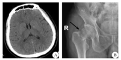 A:入院时颅脑CT未见明显异常;B:入院时骨盆正位X片提示患者右侧股骨颈骨折(箭头所示)