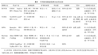 测定病毒载量的常用方法有反转录PCR(RT-PCR)、核酸序列依赖性扩增(NASBA)技术、分枝DNA信号放大系统(bDNA)和实时荧光定量PCR扩增技术(Real-time PCR)。不同病毒载量检测方法比较见表1。