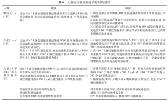 | 儿童(1~<5岁) | 无论CD4+T淋巴细胞计数结果或WHO临床分期如何,均应启动抗病毒治疗(有条件建议,极低质量证据)以下情况应优先启动治疗:所有1~2岁HIV感染患儿、重症或晚期艾滋病患儿(WHO临床3或4期)、CD4+T淋巴细胞计数≤750个/μL或<25%者(以两者数值较低者为准) | 1.目前大多数指南鼓励治疗所有5岁以下的儿童,2岁以下儿童的治疗优先对于年龄稍长的儿童,其对HIV的耐受性较婴幼儿稍好,疾病进展速度稍慢2.在CD4+T淋巴细胞检测可及性差或检测质量差的地区,如果要求使用CD4+T淋巴细胞检测结果来确定治疗标准,将延缓治疗的开始。在该年龄段,CD4+T淋巴细胞并不是一个衡量该阶段婴幼儿是否开始治疗的好标准。 |