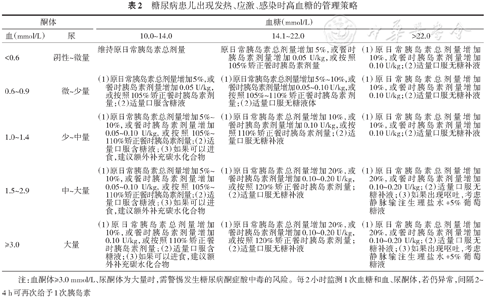 注:血酮体≥3.0 mmol/L、尿酮体为大量时,需警惕发生糖尿病酮症酸中毒的风险。每2小时监测1次血糖和血、尿酮体,若仍异常,间隔2~4 h可再次给予1次胰岛素