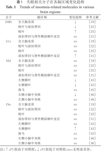 2008年,Cedernaes等[19]首次将MRS用于测量PI患者脑皮质GABA含量的研究。该实验的实验对象由32人构成,分别为16名PI患者组成的实验组和16名正常睡眠者构成的对照组,男女比例为1∶1。实验测量的范围包括基底神经节、丘脑、颞叶、顶叶和枕叶的白质及灰质。但并未将这些区域分别进行对比与讨论,而是将测量结果取平均值后作为全脑的平均GABA水平进行分析。测量结果显示:PI患者全脑的平均GABA水平较健康人群下降了30%,且GABA水平与入睡后觉醒次数呈负相关。此次实验的创新性在于将1H-MRS应用于PI患者病理生理学机制的研究,并初步提出了PI患者的全脑GABA水平下降的可能性。但因为受限,该实验结果缺乏对脑区域的解剖特异性的研究,未充分探讨与睡眠调节密切相关的丘脑腹外侧视前核[19]、海马[20]、额叶皮质[21]等脑区域的特异性变化。