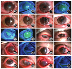 例1,患者,男,48岁,因左眼反复发红、磨痛、视力下降2个月及热泪溢出感4 d于2017年1月13日在山东第一医科大学附属青岛眼科医院就诊。患者1年前因骨髓异常增生综合征在外院接受异体骨髓干细胞移植术,术后早期出现脾脏排斥反应,应用抗排斥药物后病情稳定,半年前停药。眼科检查:右眼视力0.1,矫正视力0.2,眼压17 mmHg(1 mmHg=0.133 kPa),球结膜充血,角膜上皮粗糙,晶状体密度增高,其余未见明显异常;左眼视力0.05,不能矫正,眼压T-1,球结膜明显充血,角膜中央穿孔,白色分泌物附着,角膜基质水肿,KP(-),前房浅,前房闪辉(+),瞳孔欠圆,晶状体密度增高,位置前移,眼内窥不入(图1)。左眼溪流试验(+),角膜刮片未见微生物生长。Schirmer Ⅱ试验:右眼3 mm/5 min,左眼4 mm/5 min。诊断:左眼角膜穿孔;双眼干眼(继发性);慢性移植物抗宿主病(chronic graft-versus-host disease,cGVHD),入院后使用抗细菌和抗炎滴眼液及人工泪液点眼。2017年1月14日行左眼穿透角膜移植术(penetrating keratoplasty,PKP),术后佩戴角膜绷带镜。病变角膜细菌培养示克氏库克菌生长,药物敏感性试验示对左氧氟沙星、加替沙星、氧氟沙星、夫西地酸敏感。术后全身应用氢化可的松注射液150 mg静脉滴注,左眼局部应用质量分数0.5%左氧氟沙星滴眼液、妥布霉素地塞米松滴眼液和眼膏、体积分数20%自体血清、质量分数0.3%玻璃酸钠滴眼液,角膜上皮修复后加用他克莫司滴眼液抑制排斥反应;右眼用0.1%氟米龙滴眼液代替妥布霉素地塞米松滴眼液和眼膏,其他药物同左眼。出院眼科检查:右眼视力0.3,矫正视力0.6,球结膜轻度充血,角膜上皮略粗糙。左眼视力0.05,不能矫正,球结膜轻度充血,角膜植片轻度水肿,角膜上皮完整(图1)。术后1个月左眼角膜植片上皮缺损,调整局部用药后未修复,2017年3月2日再次入院。左眼视力0.04,不能矫正,球结膜轻度充血,角膜植片中央轻度混浊,上皮缺损4 mm×3 mm。Schirmer Ⅱ试验:右眼5 mm/5 min,左眼1 mm/5 min。角膜刮片无微生物生长。激光扫描共焦显微镜检查示病灶区大量炎性细胞浸润。诊断:左眼角膜植片溃疡;左眼PKP术后;双眼干眼(继发性);cGVHD,局部用药同右眼出院前,症状无明显缓解,2017年3月3日行双眼下泪点栓塞,角膜仍无明显修复。2017年3月6日行左眼睑缘粘连术,上下睑缘中内、中外1/3做睑缘创面永久性缝合,病情稳定后出院,1周后拆除皮肤缝线,角膜上皮愈合。