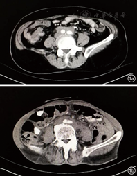 患者,女性,70岁,因"腹痛1个月"入院。患者1个月前出现全腹痛、腹胀,无发热,无恶心、呕吐,无尿频、尿急等不适。既往胃溃疡病史3年。入院后查血常规、凝血功能正常,肝肾功、电解质正常;肿瘤标志物正常;抗核抗体谱正常;免疫球蛋白A、M、G正常。胃镜检查示浅表性胃炎,肠镜检查未见明显异常。腹盆腔CT示腹主动脉及双侧髂动脉周围软组织影,考虑腹膜后纤维化(图1a)。诊断:腹膜后纤维化。患者于上级医院接受进一步治疗。电话随访患者用激素治疗后症状好转。