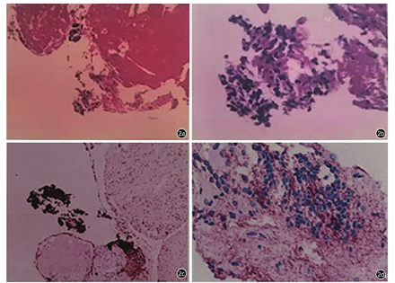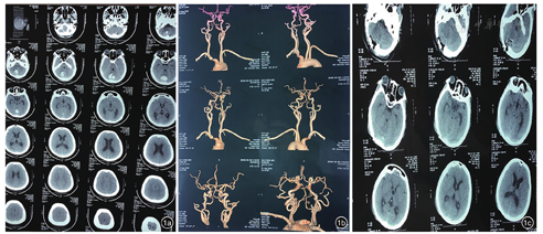 患者女性,42岁,因突发头痛、头晕5天,加重半天于2019年9月26日收住我院神经内科。既往体健。查体见神志清,言语流利,脑神经检查未见异常,颈部有抵抗感,四肢肌力5级,双侧腱反射对称(++),病理反射未引出,深浅感觉检查正常。颅脑CT:小脑见团块状高密度影,占位效应明显,第四脑室下部受压变窄,余脑室扩大,考虑小脑出血(图1a)。头颈部CTA:左侧胚胎性大脑后动脉,余未见明显异常(图1b)。血生化检查:无高血脂及高胆固醇。会诊后认为:小脑出血诊断明确,出血量约13 ml,第四脑室受压,有轻度脑积水表现,手术指征明确,建议行小脑出血开颅清除术。患者及亲属3天后同意手术,全麻下以血肿为中心做后枕部旁正中直切口,颅骨铣骨瓣成型,上方暴露至横窦下缘,硬脑膜张力高,"十"字切开硬膜,皮层造瘘直达血肿腔,血肿主体为褐色血性液体,夹杂部分凝固血块,清除血肿后,见血肿腔有黄白色珍珠样新生物及钙化,有包膜,血运极不丰富,新生物及钙化约占整个血肿的1/3,清除所有新生物,并留取标本行病理检查。术后复查CT较满意(图1c)。常规病理:镜下见出血坏死组织,伴钙化及胆固醇结晶形成,局部见微量短梭形细胞,细胞性质及类型待定;免疫组化结果:短梭形细胞Vimentin(+),GFAP(+),CD56(+),Syn(+),NSE(+),结合颅脑CT的出血性表现考虑为小脑陈旧性出血、坏死组织伴含铁血黄素沉着、钙化及胆固醇结晶性肉芽肿形成(图2)。