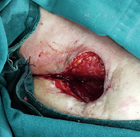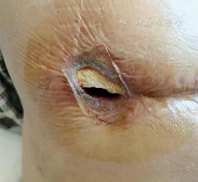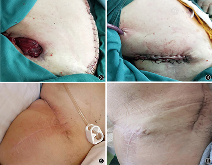 手术操作:采用全身麻醉,患者取平卧位,患侧臀下垫一小薄枕。先行受区创面清创(图1),去除创面坏死与炎性肉芽组织并切除条件较差的皮缘,咬除外露坏死的骨质。再用3%的双氧水和0.9%氯化钠溶液反复冲洗创面后,用0.5%碘伏纱布临时填塞死腔(图2)。然后,从同侧脐旁向外2 cm,纵行向下切约8 cm,切口再向外斜行转向腹股沟韧带中点。切开皮肤、皮下至腹外斜肌腱膜和腹直肌前鞘表面。纵行切开前鞘,将腹直肌向内翻,显露出腹壁下动脉血管束,结扎其余血管分支。将其向脐旁游离,比受区所需充填的组织瓣稍大,以腹壁下动脉至脐旁筋膜的穿支血管为中心,切取连带部分腹直肌和其上筋膜瓣,形成以腹壁下动脉为蒂的肌筋膜瓣。将血管蒂游至腹股沟韧带附近,取出填塞死腔的纱布,从腹部切口下端皮下向死腔底部做一隧道。检查隧道够宽后,遂用肌筋膜瓣经隧道带蒂转移至受区,充填死腔和修复软组织缺损(图3),并在死腔底部留置负压引流管。检查肌筋膜瓣血管蒂无扭曲、张力适当及血运良好后,供区创面一期缝合,特别注意在腹直肌前鞘切开处行粗丝线加强缝合。受区创面经两侧皮下潜行分离后,直接拉拢缝合(图4)。