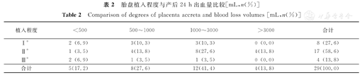 本组29例患者产后24 h出血量比较(表2)显示,出血量超过1000 mL为16例(55.17%,16/29),因胎盘植入导致的产后出血(PPH)发生率高达82.76%(24/29),但无一例产妇死亡。胎盘植入程度与PPH的关系比较,统计学意义不确定(χ2=12.7586, 0.01<P<0.05)。
