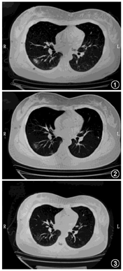服药初期有乏力等临床症状,服药期间未出现发热等其他不适,服药5 d后临床症状明显缓解。服药7 d后稍有呼吸胸痛,后明显缓解,病情未见反复。2月4日因个人原因暂停继续服药,2月7日出院时在基础方的基础上调整部分药物剂量加入陈皮、枳壳各10 g,带药5剂出院,2月9日电话随访无特殊不适。1月21日确诊CT因个人原因,无法取得影像资料。复查CT见图1,图2,图3,服药后CT显示在第7天可见感染灶明显吸收,显效。