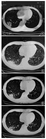 例4,例5患者中1例临床症状缓解,因药材短缺仅能服药3 d,服药第2天后复查CT(1月27日)较1月22日肺部感染灶有进展,缺乏评价资料无法评价;另一例患者因反复发热5 d以上确诊疑似病例,在基础方的基础上柴胡调为25 g,金银花20 g,蒲公英20 g,服药第3天后症状缓解,但因个人原因暂未继续服药。