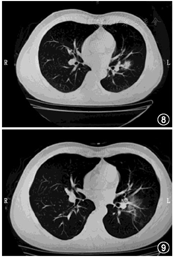 例3 患者男,37岁,有明确接触史。因反复发热,体温均低于38.5℃,伴胸闷、四肢乏力等不适,1月23日行胸部CT确诊为疑似病例(图8),1月25日晚开始服药,在基础方的基础上蒲公英增量至15 g,因药材原料缺乏问题,药材仅能使用3 d,1月29日药品服完,1月31日复诊,再次出现低烧。复诊CT见图9。因患者疗程不够,暂无法对疗效进行评估。
