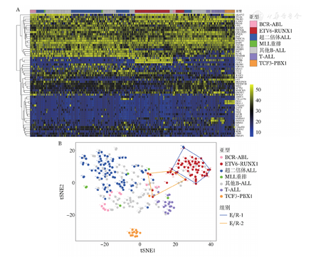A:264例ALL患儿GeXP数据聚类分析。根据57个分型基因在264例ALL样本中相对表达量排序值进行聚类分析。行为基因,列为病例;黄色表示表达量排序值高,蓝色表示表达量排序值低。B:264例ALL患儿基因表达谱数据tSNE1分布图。图中每一个点代表一个样本,点的颜色与分型对应,不同线条构成的区域分别为E/R-1、E/R-2空间散布范围。可见E/R-1与E/R-2两组毗邻,但E/R-2在空间上更离散(spearman相关系数=0.788<0.901)