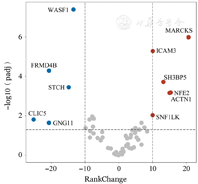 为探究两组基因表达差别,根据各基因表达的Rank值,利用t检验对两组差异基因P值进行FDR校正,校正后P值<0.05且|RankChange|>10视为差异有统计学意义,共发现11个基因存在表达差异,即WASF1、FRMD4B、STCH、CLIC5、GNG11基因在E/R-2组相对低表达(P<0.05);而MARCKS、ICAM3、SH3BP5、NFE2、ACTN1、SNF1LK基因在E/R-2组相对高表达(P<0.05);其余基因表达在两组间差异无统计学意义(图2)。