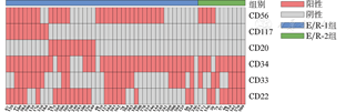我们将两组在基本临床特征、白血病免疫分型及早期化疗反应方面进行异质性分析时发现,两组均有初诊时血象受抑制的病例,但E/R-2组PLT多不减低(>100×109/L),这可能是相对较低的骨髓肿瘤细胞比例更低程度抑制血小板生成的结果。对白血病细胞免疫标记组合分析除有利于区分正常幼稚细胞外,还有利于减少治疗及多克隆造成的假阴性结果,Vervoordeldonk等[12,13]认为CD22+CD34+CD20-免疫组合可能预测白血病复发,一定程度上也显示了组合免疫表型分析在检测肿瘤细胞中的高灵敏性。本次研究中CD22+CD34+CD20-免疫表型两组比较差异虽无统计学意义(P=0.099),但该表型在E/R-2组有占优的趋势,需扩大样本量进一步验证。利用聚类热图,进一步发现CD22+CD34+CD20-CD117-CD56-免疫表型集中在E/R-2组且差异有统计学意义(P<0.001),根据分化抗原的表达特性提示E/R-2白血病细胞可能在CD22+CD34+CD20-表型基础上跨系表达和非同步表达程度较E/R-1更小,由于目前暂无长期预后数据,该组合表型的实际临床意义有待观察。值得注意的是,Chen等[13]的研究结果提示MRD检测靶标在初诊有多型亚克隆的情况下可能随病程的衍进而变化,导致假阴性的结果,结合E/R-2可能存在初诊多克隆以及两组在化疗第33天MRD(流式细胞术)敏感性分析、第33天MRD(PCR)转阴情况分析中呈现出差异,我们推测E/R-2可能存在化疗第33天MRD更难转阴的趋势,但受限于样本量,两组间差异无统计学意义,而CD22+CD34+CD20-CD117-CD56-免疫组合表型是否与之相关,需进一步验证。目前研究认为诱导期的MRD水平是判断预后的重要指标,MRD阳性预后较差,由此我们推测E/R-2组为相对预后不良组[14,15]。