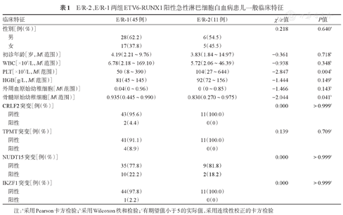 E/R-2、E/R-1两组ETV6-RUNX1阳性急性淋巴细胞白血病患儿一般临床特征