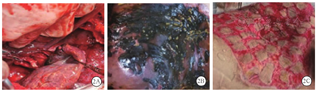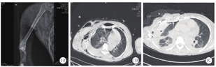 患者入院后立即给予气管插管、右侧胸腔闭式引流、呼吸机辅助呼吸,输注红细胞、血浆、血小板、冷沉淀、白蛋白等损伤控制性液体复苏,维持收缩压在80~90 mmHg,Hb 70~90 g/L。在纠正休克和凝血功能障碍的同时,于当日17:00在全麻下行右上肢软组织清创、截肢术。因右侧胸腔闭式管中引流出大量气体,氧合难以维持,改为双腔气管插管左侧单肺通气。术中发现患者右上肢肩关节下5 cm肱动脉残端搏动,皮肤、肌肉、血管、神经及骨骼广泛损伤,部分失去正常形态结构、失活,遂行肱骨下5 cm线锯离断截肢及坏死组织清创术,40 min后手术顺利结束。术后患者气管导管内出现大量粉红色分泌物,吸纯氧条件下脉搏血氧饱和度(SpO2)0.70,PaO2/FiO2 39 mmHg,在常规处理无效情况下立即给予俯卧位通气,SpO2升高至0.90,PaO2/FiO2 62 mmHg。4月8日患者循环稳定,Lac 1.2 mmol/L。4月13日13:00在左侧单肺通气下实施右侧肺部手术。术中可见右肺叶萎缩,表面有5处裂口,中间段支气管纵向裂口延长至中叶,仅1/3相连,下叶支气管完全断裂(图2A)。行右侧肺破裂处"8"字缝合、肺中下叶切除术,并用肋骨环保器固定第3~7肋,手术2.5 h顺利结束。术后患者出现肺水肿,脑钠肽(BNP)2 900 ng/L,给予左西孟旦强心,提高胶体、限制晶体及利尿等治疗后病情逐渐好转。为便于吸痰及呼吸道管理,4月14日将双腔气管插管改为单腔气管插管。4月17日在纤维支气管镜引导下行气管切开。4月18日患者呼吸困难缓解,PaO2/FiO2为320 mmHg,胸部CT可见右肺中下叶缺失,右侧膈肌升高,右侧上胸廓塌陷,胸腔积液,残留右肺上叶见条索状、斑片状高密度影(图1C)。4月22日,因胸、肩部等处大面积皮肤坏死(图2B),行胸部扩创切痂、坏死组织清除、创伤敷料覆盖微负压引流术。5月25日择期行"邮票"植皮术,效果满意(图2C)。