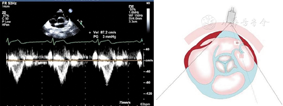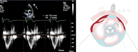胸骨旁主动脉瓣短轴切面,显示收缩期肺动脉峰值速度测量方法。在肺动脉瓣瓣上远心端1 cm处管腔中央获取