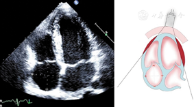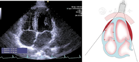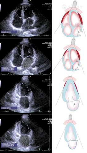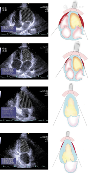 (3)为了避免心尖切面观测时左心房及右心房或左心室、右心室的人为缩短效应,应仔细调整探头以获得最大长轴内径的左心房和右心房或左心室及右心室的腔室显示。应采用左侧卧位,避免采用过软床垫,避免过分相信触诊扪及的心尖搏动位置,通过调整探头位置和角度,选择左心室最大长轴内径切面进行测量。